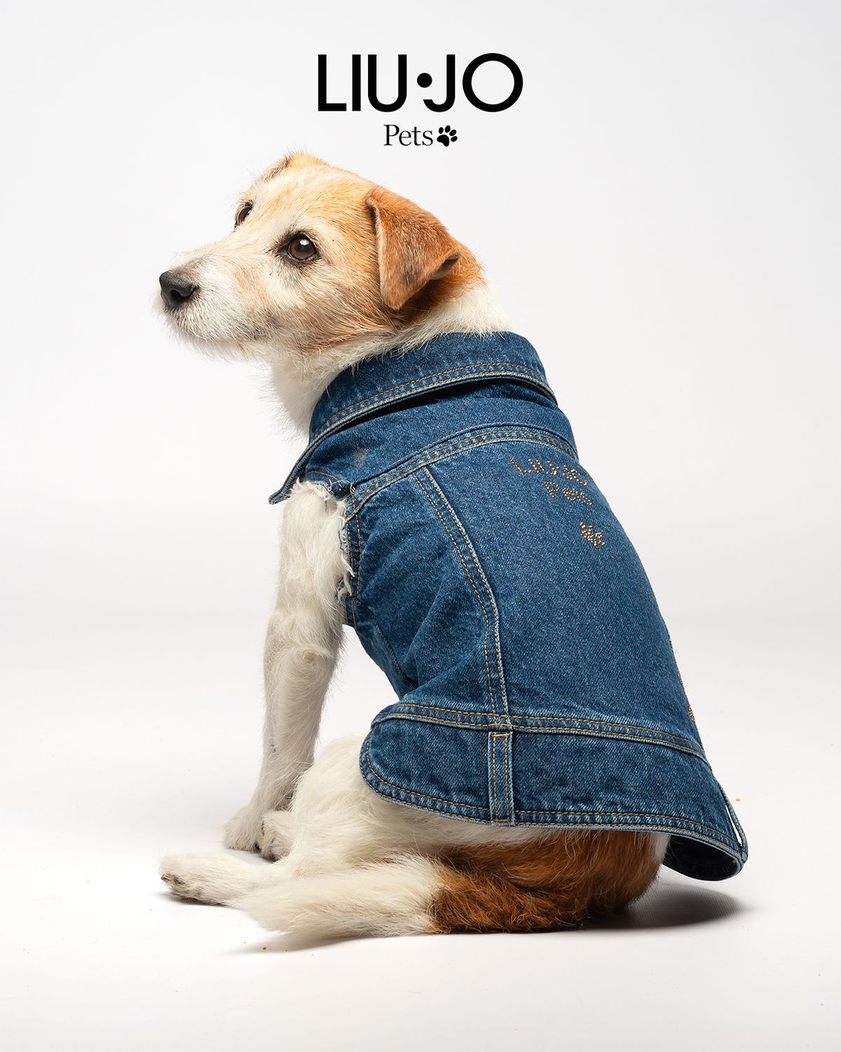 Denim jacket with a glamorous soul, embellished with gold-copper studs forming a star pattern and logo. Fabric is washed and specially treated to respect the animal’s fur. Lightly padded for extra comfort, with a button closure under the belly for a perfect fit. Suitable for small, medium, and large dogs.