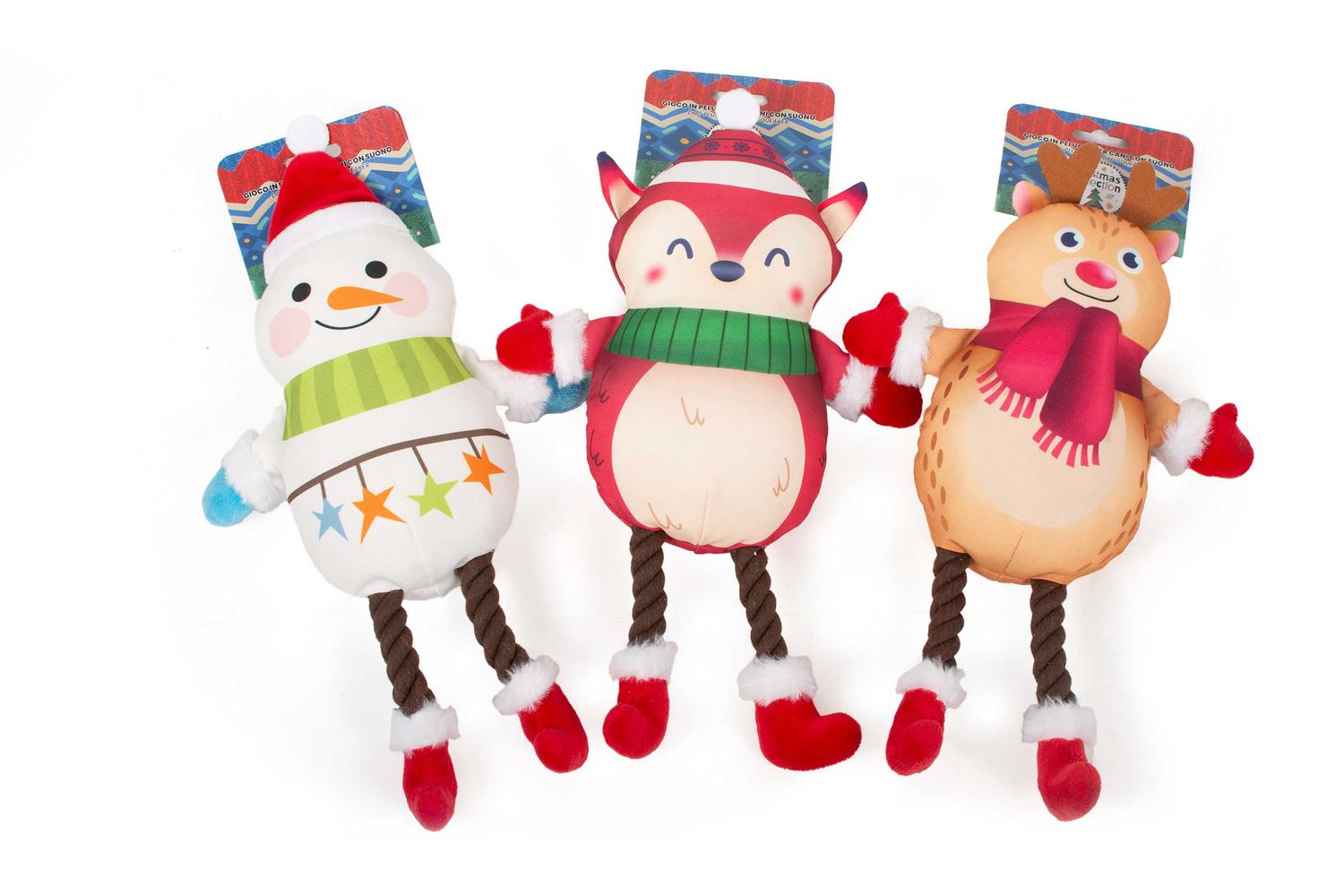 Brighten your holiday section with these cheerful figures: A playful fox, classic reindeer or a cute snowman. Each toy features durable rope legs for tug and chew games, a soft plush body, and a squeaker for extra excitement. Perfect for families looking for a unique Christmas dog gift.